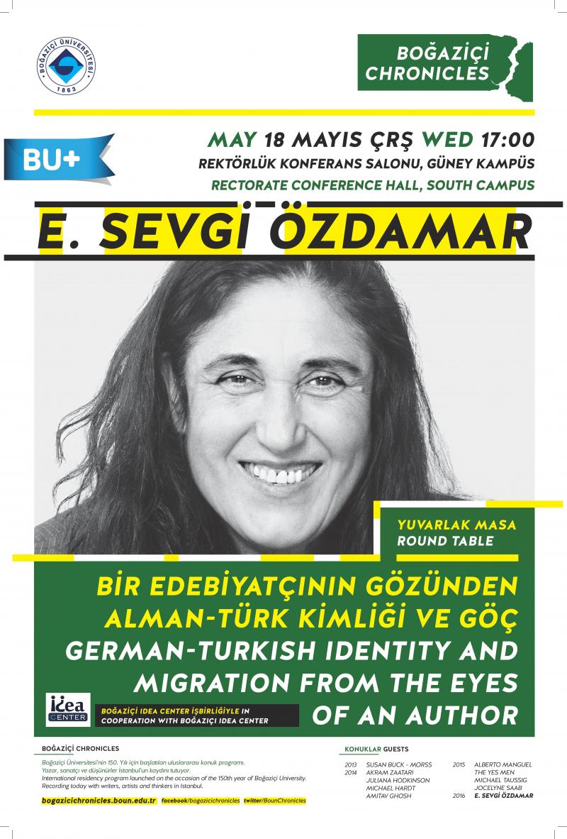 Boğaziçi Chronicles'ın son konuğu E. Sevgi Özdamar 18 Mayıs'ta Boğaziçi Idea Center ile buluşarak "Bir Edebiyatçının Gözünden Alman-Türk Kimliği ve Göç" temalı bir söyleşi gerçekleştirdi. Söyleşide Özdamar, bir göçmen olarak kişisel deneyimleri ile bu temaları işlediği eserlerindeki detaylar üzerine katılımcılarla sohbet etti.
