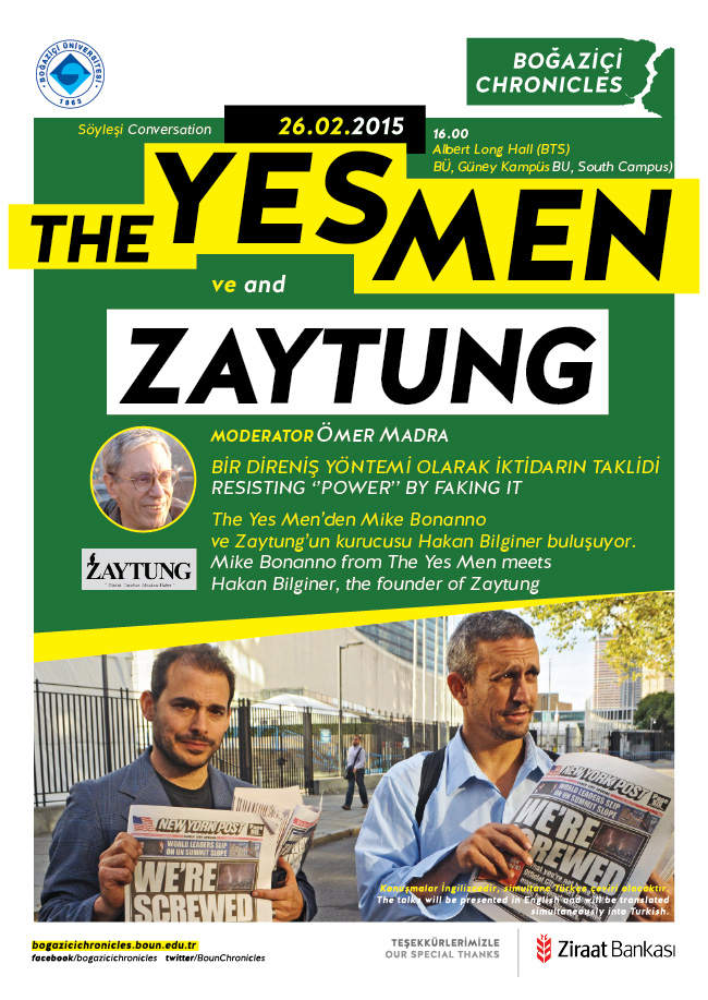 Şirketlerin veya kurumların temsilcileri olarak kendini tanıtıp, ‘kurbanlarının’ tutumlarının ya da politikalarının tam tersi olacak şekilde, çoğu zaman absürd açıklamalar yapıp ses getiren eylemlere imza atan The Yes Men, ironi ve mizahı kullanarak Türkiye’de yepyeni bir haber dili yaratan Zaytung’un kurucusu Hakan Bilginer ile 26 Şubat 2015 tarihinde ortak bir etkinliğe imza atacak. Boğaziçi Üniversitesi Güney Kampus, Albert Long Hall'de saat 16.00'da gerçekleşek söyleşiye Ömer Madra moderatörlük yapacak. The Yes Men’den Mike Bonanno ve Zaytung’un kurucusu Hakan Bilginer "Bir Direniş Yöntemi Olarak İktidarın Taklidi" etkinliğinde yapacakları konuşmaların yanı sıra Boğaziçi Chronicles izleyicilerinin sorularını da yanıtlayacaklar.